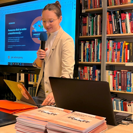 Ewa Kiwak i Agnieszka Jarolewska, pracownice CDN PBP w Koninie, zaprezentowały narzędzia na bazie AI, które mogą pomóc w pracy nauczyciela i wspomagać jego kreatywność: SongR AI, CRAIYON AR, MAGIC ERASER AI. Natomiast dr Aleksandra Monkos ze Stowarzyszenia Demagog w wystąpieniu „Pomocna dłoń w walce z dezinformacją. O Akademii Fact-checkingu i innych edukacyjnych inicjatywach Stowarzyszenia Demagog” omówiła inicjatywy z jakimi wychodzą do szkół, aby wspomóc nauczycieli w edukowaniu dzieci i młodzież na temat zagrożeń w sieci i uczeniu ich krytycznej analizy informacji dostępnych w sieci, czyli jak rozpoznać AI w przestrzeni internetu.
