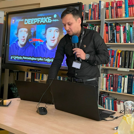 Rafał Bajdek, kierownik uczelnianego Centrum Druku i Skanu 3D, zademonstrował wiele zastosowań praktycznych AI, programów, z których na co dzień możemy korzystać w pracy i domu, np. obrabianie zdjęć, pisanie tekstów, tworzenie grafik itp. Mówił o rozwoju AI w kontekście wojny w Ukrainie i o Chinach jako państwie już w tym momencie nasyconym sztuczną inteligencją w sposób ograniczający swobody obywatelskie przez użycie Systemu Oceny Obywatela.