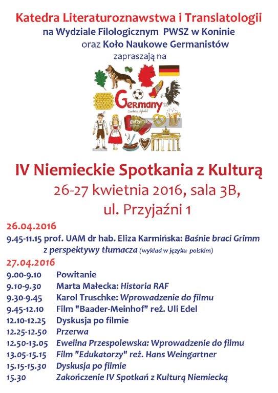 Katedra Literaturoznawstwa i Translatologii na Wydziale Filologicznym PWSZ w Koninie oraz Koło Naukowe Germanistów zapraszają na IV Niemieckie Spotkania z Kulturą