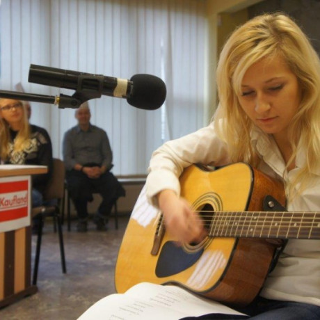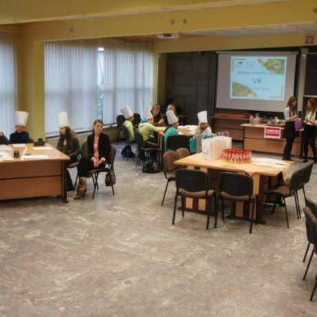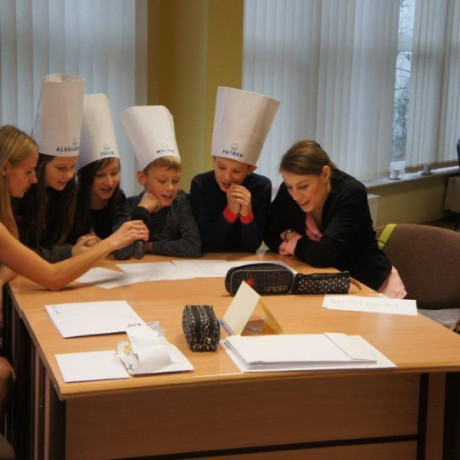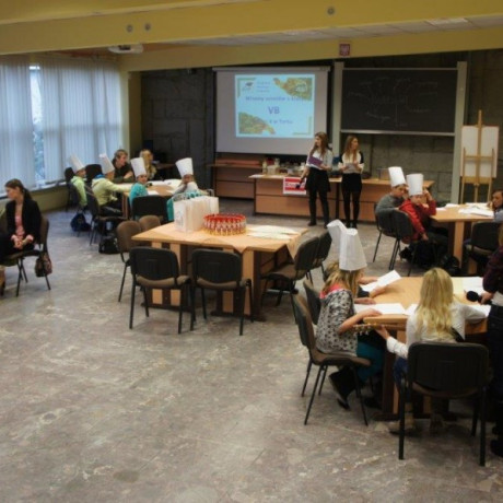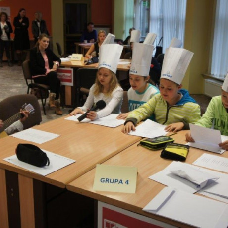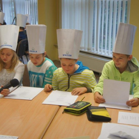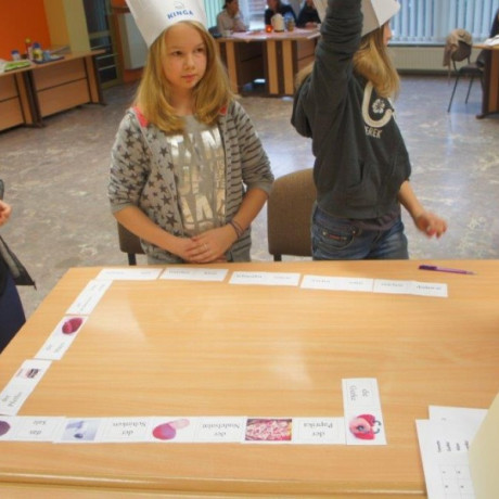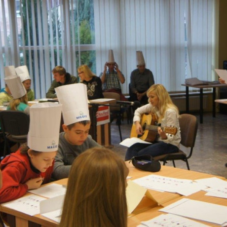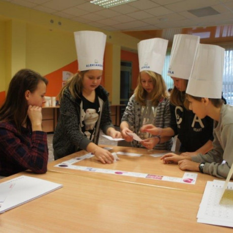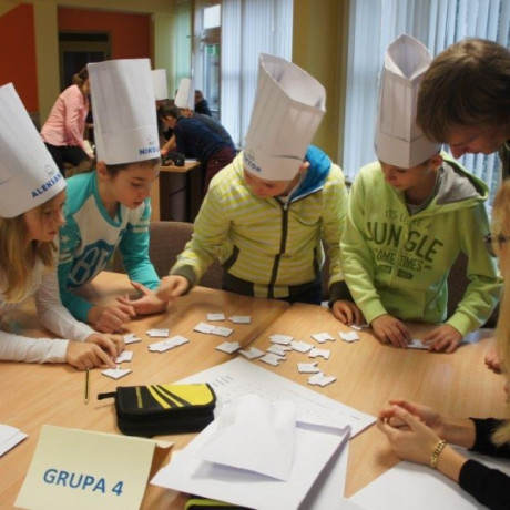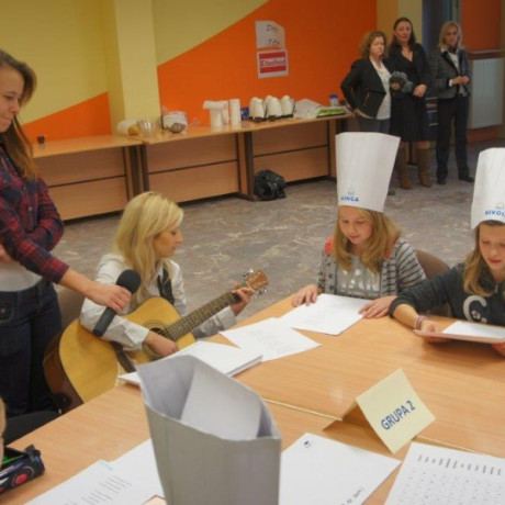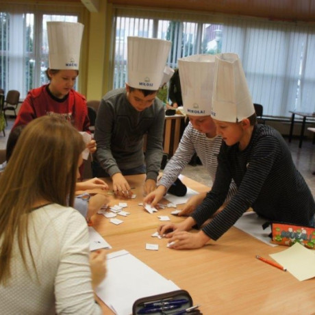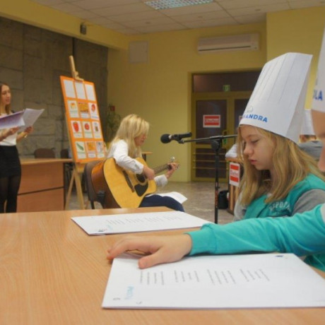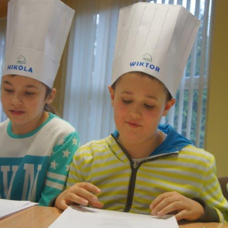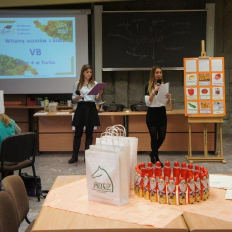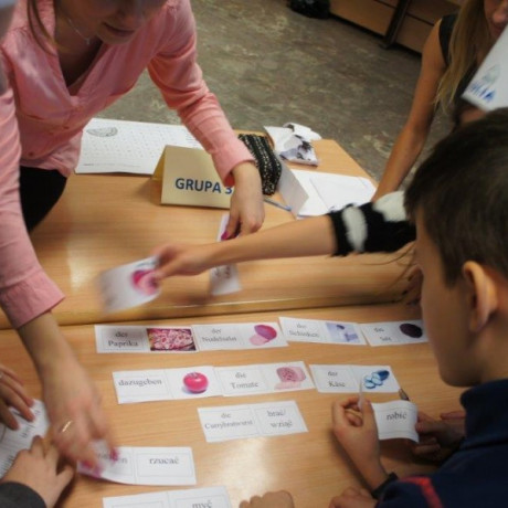 Tym razem gośćmi AMS byli uczniowie klasy 5b ze Szkoły Podstawowej nr 4 w Turku. Tematyka zajęć, które pod okiem dr Joanny Chojnackiej-Gärtner, prorektor ds. rozwoju i promocji, poprowadzili „starsi” studenci III roku germanistyki, była związana z kuchnią i kulinariami. Wyposażeni w deski i noże „młodsi” studenci kroili składniki sałatki makaronowej, czyli Nudelsalat. Wcześniej głośno powtarzali ich nazwy oraz nazwy przypraw. Określali też kolor: ‒ der rote Paprika, die grüne Gurke, der gelbe Käse, das weisse Salz, der schwarze Pfeffer. Dla utrwalenia słownictwa śpiewali przy akompaniamencie gitary piosenkę o przygotowywanej potrawie. Między kolejnymi wykonaniami przeboju tej akademii, studentki germanistyki sprawnie przeprowadzały konkursy wykorzystujące starszą i nowo nabytą wiedzę językową.