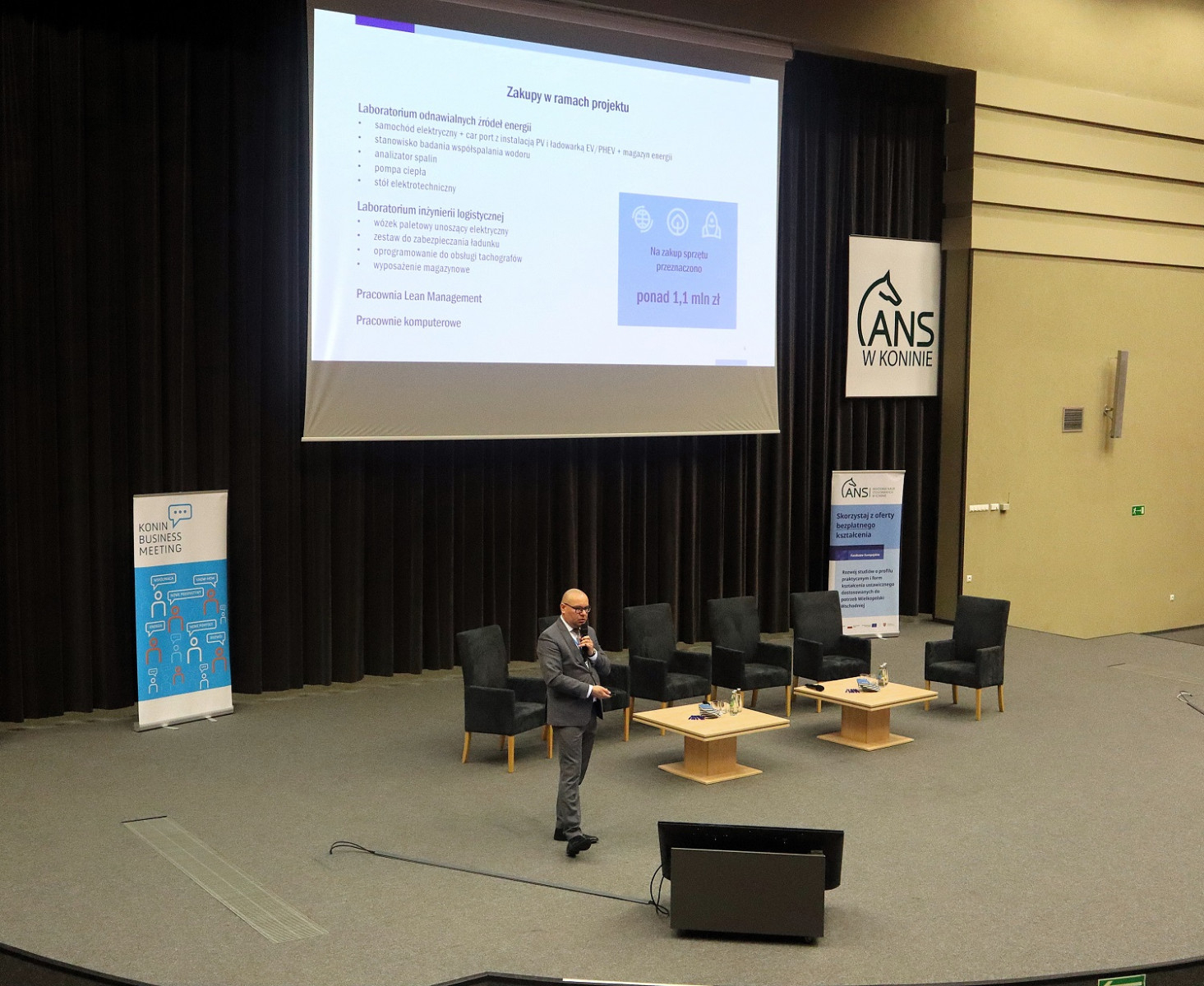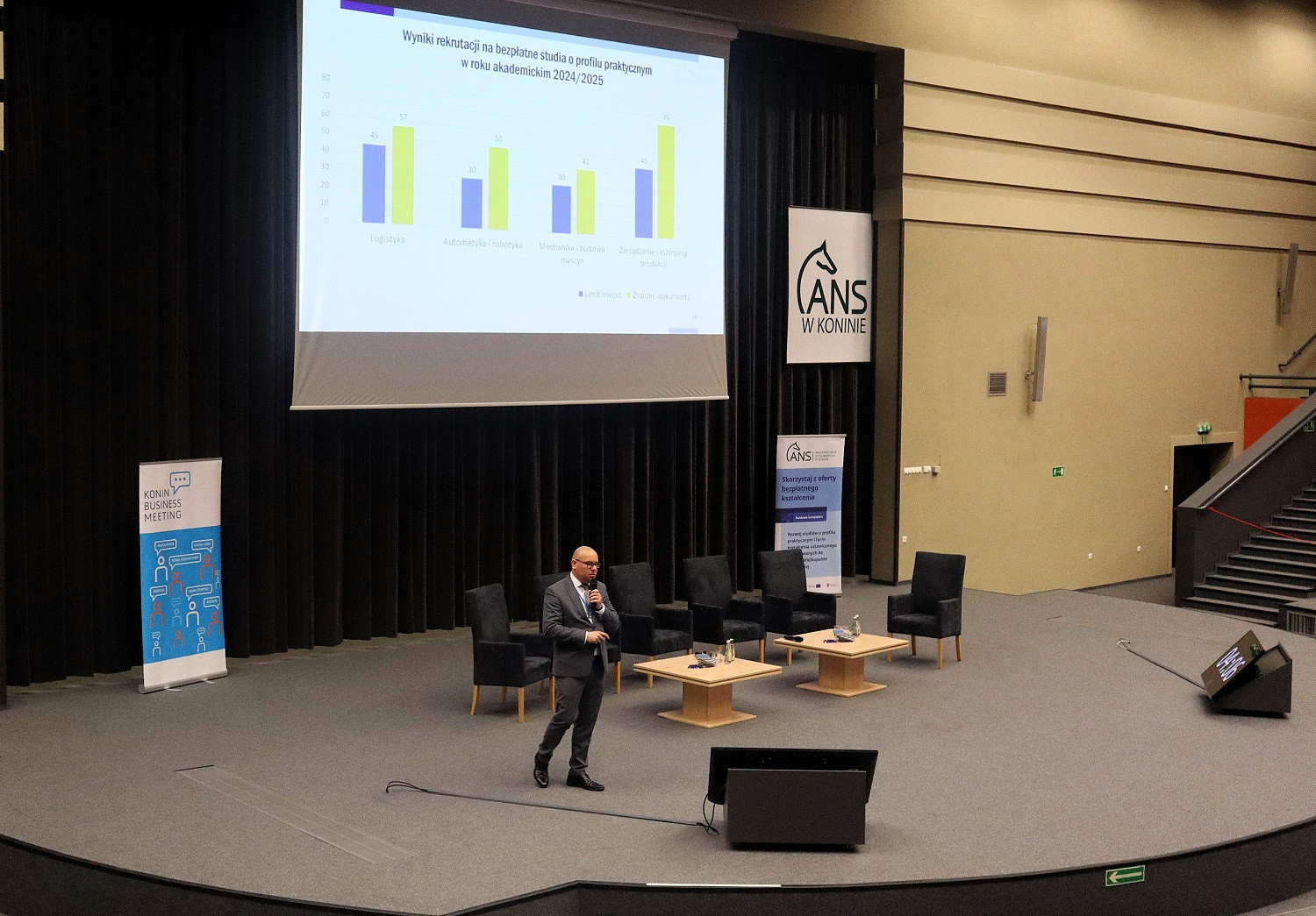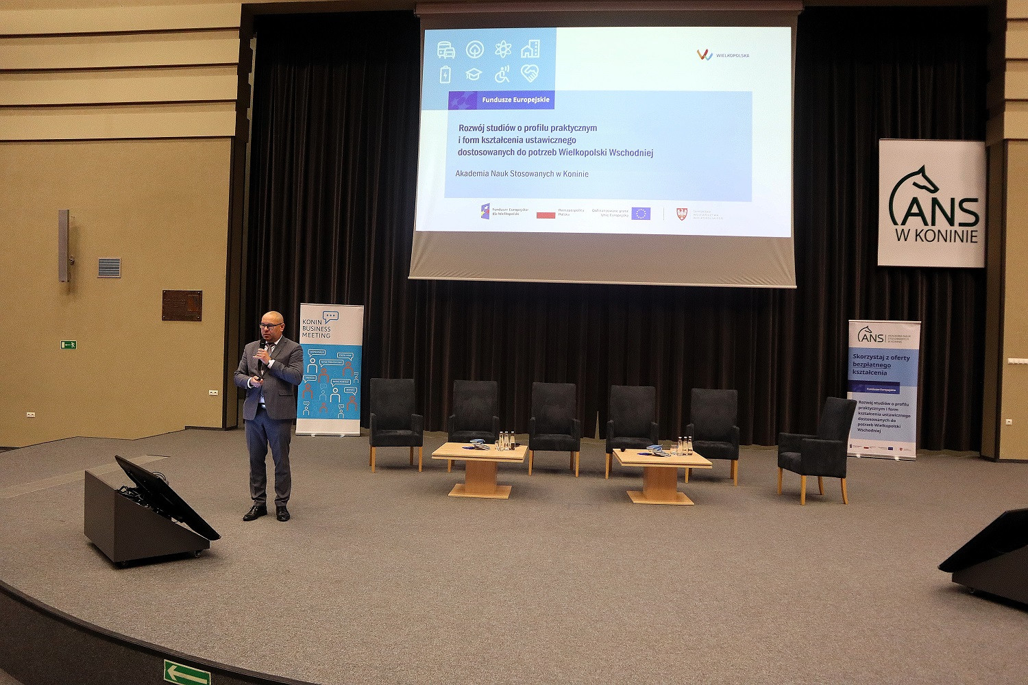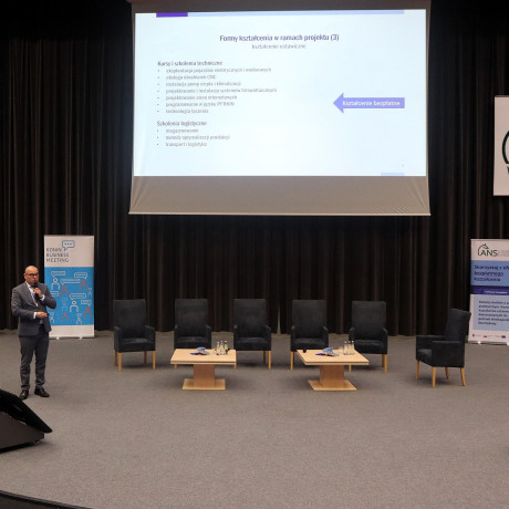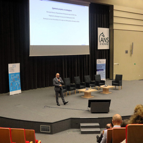 Podczas spotkania (24 kwietnia) dr hab. Artur Zimny, prof. i rektor ANS w Koninie, zaprezentował efekty realizowanego od tego roku akademickiego projektu „Rozwój studiów o profilu praktycznym i form kształcenia ustawicznego dostosowanych do potrzeb Wielkopolski Wschodniej”. Mówił m.in. o wynikach naboru na bezpłatne kierunki studiów, kursów i szkoleń oraz o zakupach pomocy dydaktycznych i wyposażenia – wszystko w ramach projektu.