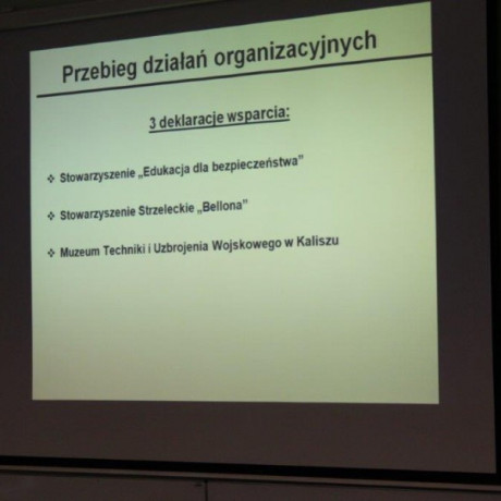 Oprócz przedstawicieli uczelni zaangażowanych w projekt w spotkaniu uczestniczyli studenci bezpieczeństwa wewnętrznego PWSZ w Koninie. Jako pierwszy prelegent wystąpił prof. nadzw. dr hab. Ireneusz T. Dziubek z PWSZ w Koninie, Przewodniczący Rady Naukowej projektu. Wygłosił referat wprowadzający w jego cele, założenia i przybliżył etapy jego realizacji. Następnie dr Konrad Hennig z WSH-E w Sieradzu mówił o zintegrowanym systemie bezpieczeństwa państwa, z uwzględnieniem Obrony Cywilnej, Obrony Terytorialnej i Narodowych Sił Rezerwy. Mgr Maciej Paszyn z Wydziału Zarządzania i Dowodzenia AON mówił o analizie potencjału organizacji proobronnych w procesie tworzenia GN w Polsce. Także temat Gwardii Narodowej (GN) poruszyła w swoim wykładzie dr Bogumiła Pawlaczyk z Wydziału Zarządzania PWSZ w Kaliszu, skupiając się na formalnoprawnych aspektach warunkujących jej utworzenie oraz mgr Pamela Zimoch z PWSZ w Kaliszu, mówiąc o naborze i selekcji do tej formacji.