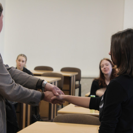 Mgr Artur Cygan, mgr Tomasz Naglewski i mgr Marcin Olejniczak przygotowali uczniom warsztaty zatytułowane „Mowa ciała - droga do porozumienia”. Warsztaty podzielone były na dwie części, pierwsza teoretyczna, obejmowała wprowadzenie do tematyki komunikacji niewerbalnej. W ramach drugiej części spotkania, uczestnicy mieli możliwość zapoznać się ze slajdami i ikonami przedstawiającymi podstawowe komunikaty niewerbalne. Zadaniem uczniów było zinterpretowanie zaprezentowanych gestów, mimiki i postaw ciała i następnie wraz z prowadzącym dokonanie weryfikacji zaproponowanych interpretacji. Podczas spotkania uczniowie zostali zapoznani również z kilkoma typami powitania poprzez uścisk dłoni, a następnie mieli okazję poćwiczyć ich zastosowanie.