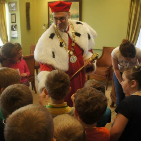 Stałym punktem każdego wydania AMS jest spacer po uczelni. Pierwszoklasiści zwiedzili więc budynek przy ul. Przyjaźni i na zaproszenie prof. Mirosława Pawlaka odwiedzili go w jego rektorskim gabinecie. Obejrzeli również rektorską togę, czapkę i insygnia, a przy okazji szukali ukrytych tam karteczek z wizerunkami zwierząt. W drodze powrotnej nie pozostali bez pracy, bo i na korytarzach, dzięki uważnej obserwacji, mogły znaleźć kolejne.