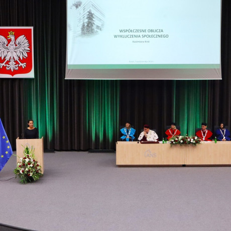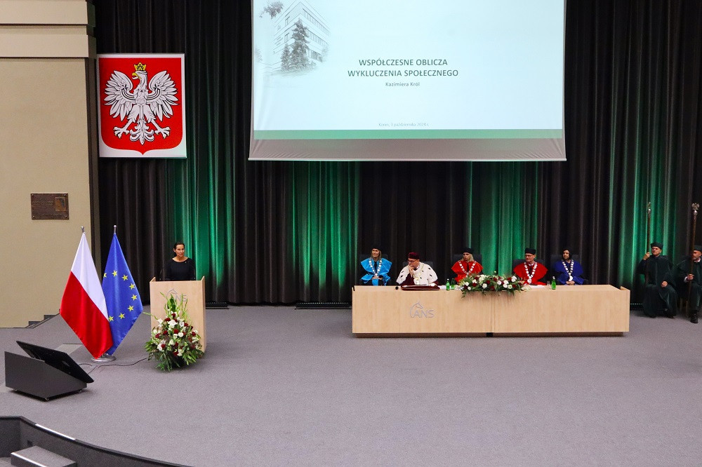 Wykład inauguracyjny, który kończy uroczystość, wygłosiła w tym roku dr Kazimiera Król, prof. ANS w Koninie. Mówiła o współczesnych obliczach wykluczenia społecznego, problemie, którym naukowo zajmuje się od wielu lat. – Że wykluczenie jest procesem i zawsze ma jakąś przyczynę. Że łatwo wykluczyć ze społeczeństwa, ale trudno do niego włączyć. Że nie należy walczyć z człowiekiem, ale z jego problemem: – Choć ci ludzie często nie odpowiadają naszym paradygmatom. Tego musimy się nauczyć – apelowała. Zaapelowała również do obecnych w auli im. Jana A.P. Kaczmarka przedstawicieli lokalnych samorządów, by zatrudniali streetworkerów, pedagogów ulicy, którzy pracują z wykluczonymi poza instytucjami.