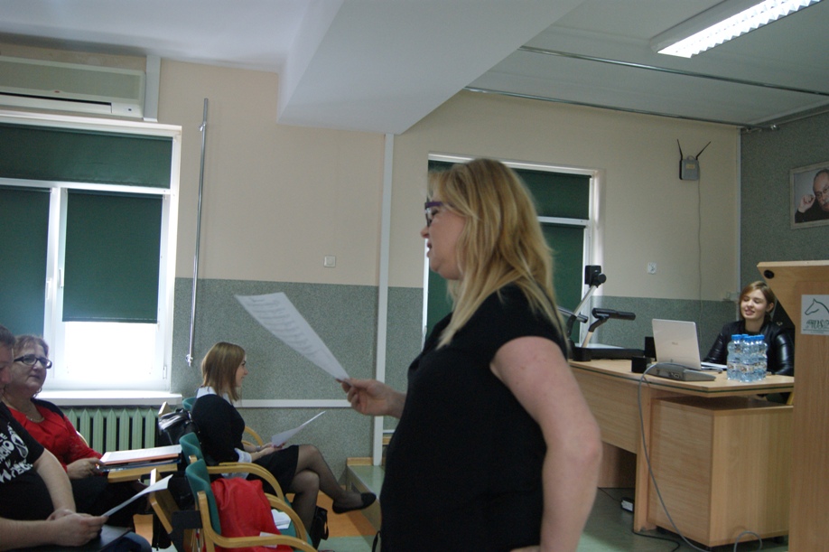 Magdalena Nowacka i Ewelina Wawrzyniak (studentki II roku pedagogiki) przedstawiły zagadnienie dotyczące roli i znaczenia muzyki i ruchu w nauczaniu języków obcych. Mówiły o tym, jak ważny jest dla dziecka kontakt z rytmizowaniem, artykułowaniem, akcentowaniem i intonowaniem w trakcie nauki języka obcego.