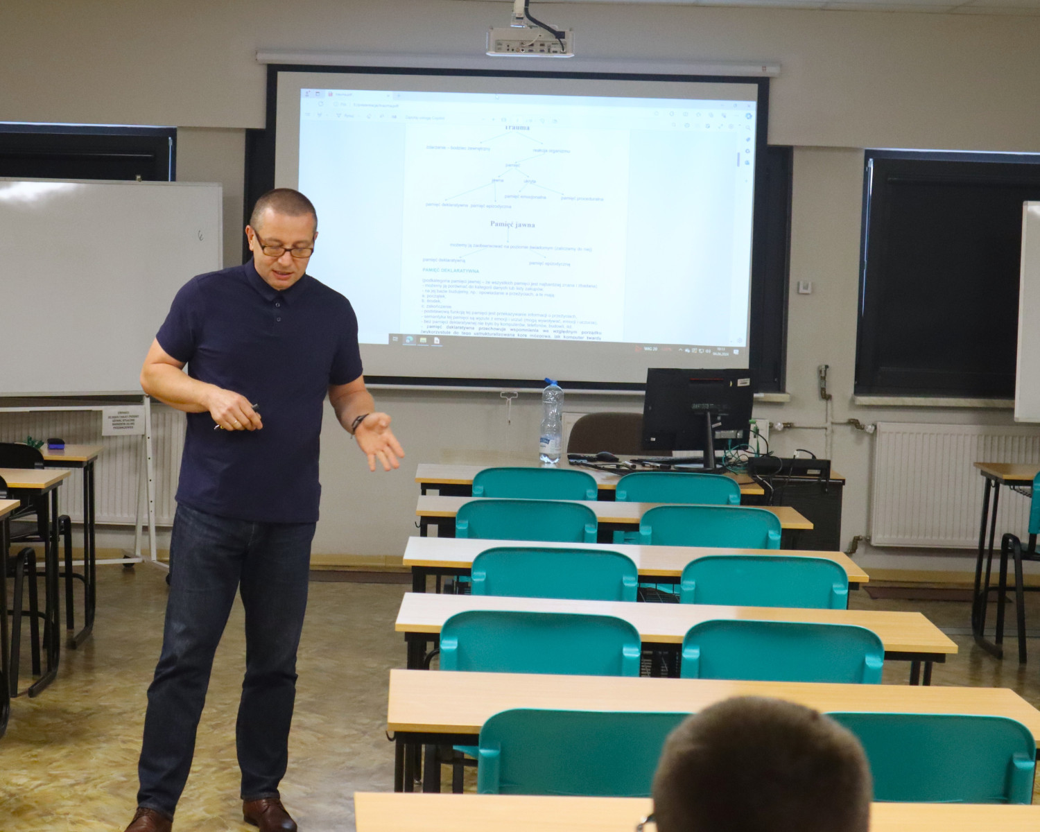 Drugą część wizyty na uczelni wypełniły zajęcia z dr. hab. Jakubem Bartoszewskim, prof. ANS w Koninie, które zatytułował „Człowiek – to brzmi dumnie. Emocje a relacje”. – Uczniowie poznali metody pracy z emocjami oraz techniki stosowane w zaburzeniach lękowych, które pomagają rozładować nadmierne emocje i stres. Zajęcia miały formę warsztatów. Opierały się na modalności psychoterapeutycznej, zwanej psychoterapią skoncentrowaną na możliwości – wyjaśnił prowadzący.