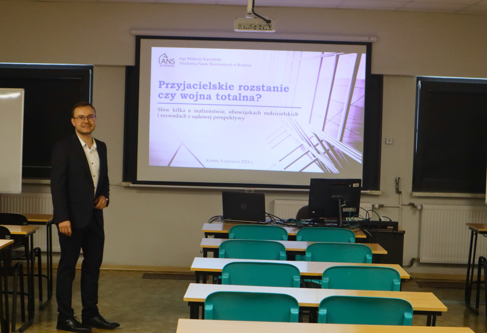 „Przyjacielskie rozstanie czy wojna totalna?” to temat pierwszego spotkania, które poprowadził mgr Mateusz Kaszyński, asystent sędziego w Sądzie Apelacyjnym w Poznaniu. Najpierw mówił o aspektach prawnych związanych z zawarciem małżeństwa oraz prawami i obowiązkami małżonków, które wynikają z przepisów Kodeksu rodzinnego i opiekuńczego. Następnie przeszedł do postępowań rozwodowych w praktyce orzeczniczej sądów. Wyjaśnił przy tym normatywne podstawy ustalania wysokości alimentów od rodziców na rzecz małoletnich dzieci. Celem zajęć było uzmysłowienie słuchaczom, że wstępując w związek małżeński, warto poznać przepisy, które kształtują relacje między małżonkami i dziećmi, aby w kryzysie możliwe było skuteczne wykorzystanie odpowiednich instrumentów dla zabezpieczenia interesów każdej ze stron.