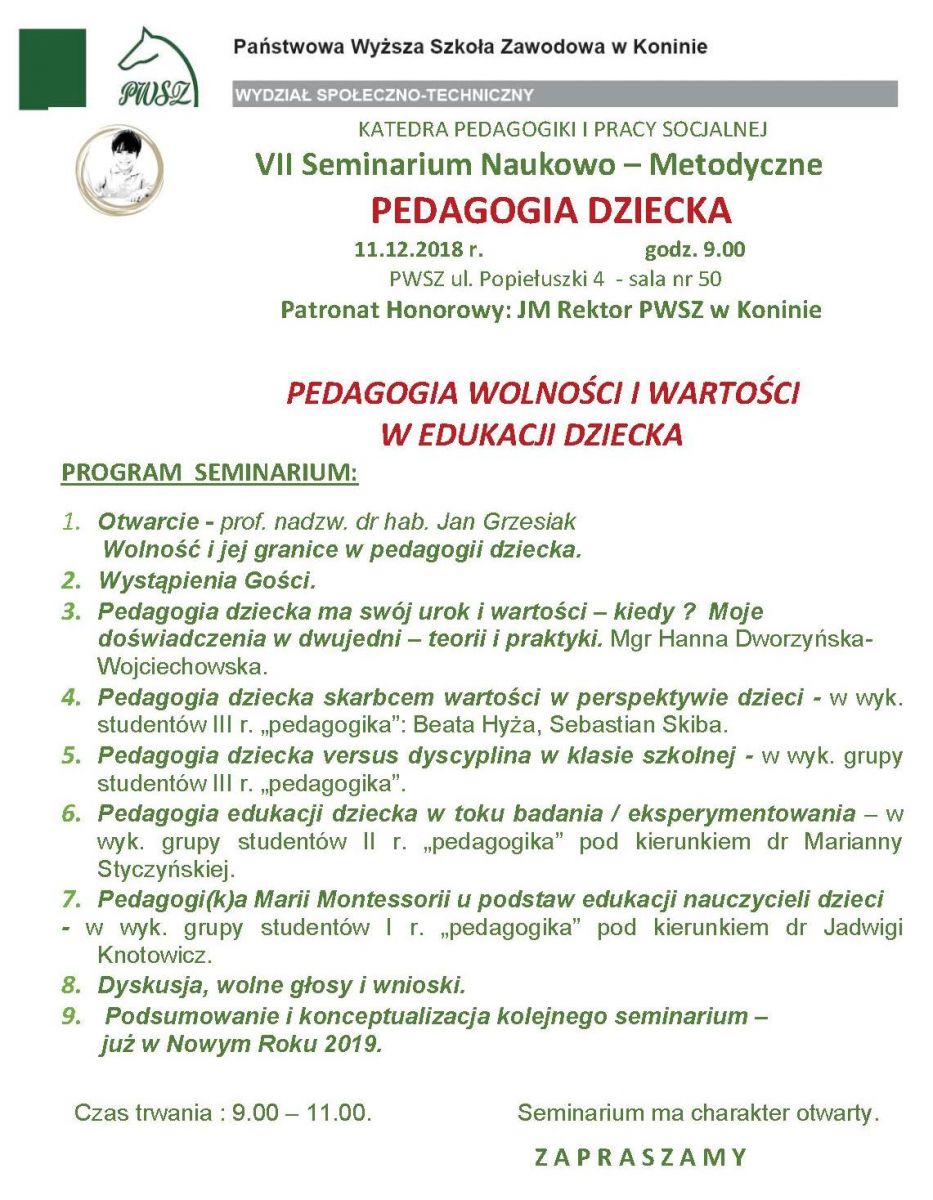 Było to kolejne VII seminarium - jako kontynuacja cyklu tego rodzaju spotkań naukowo – metodycznych, które pod kierunkiem naukowym Prof. PWSZ dr hab. Jana Grzesiaka miały miejsce w poprzednim roku akademickim. Tym razem dialogi i dyskursy odbywały się pod hasłem „Pedagogia wolności i wartości w edukacji dziecka”. Uroczyste otwarcie seminarium zostało opatrzone wprowadzeniem pt. „Wolność i jej granice w pedagogii dziecka”, po czym uczestnicy seminarium mieli okazje do recepcji wystąpień i pokazów ujętych w programie.