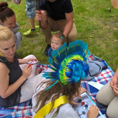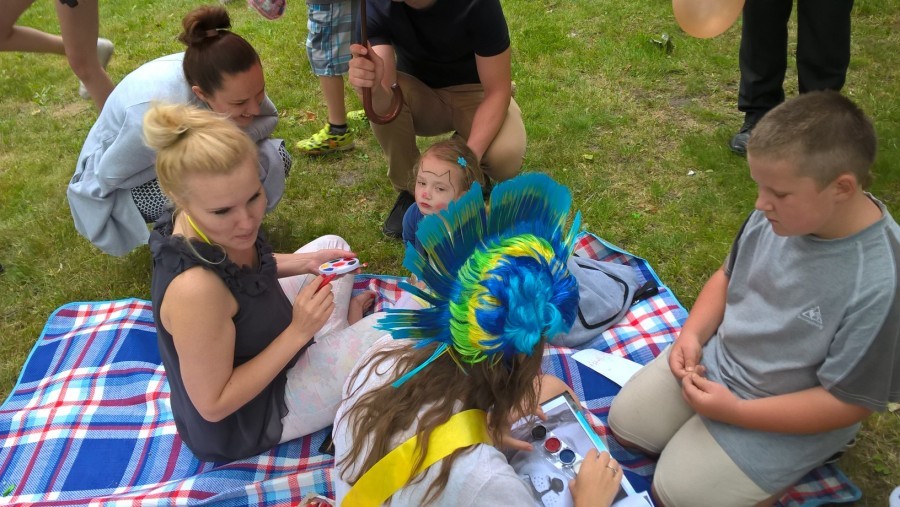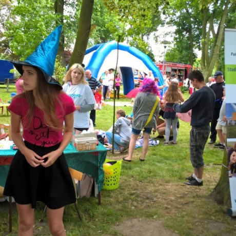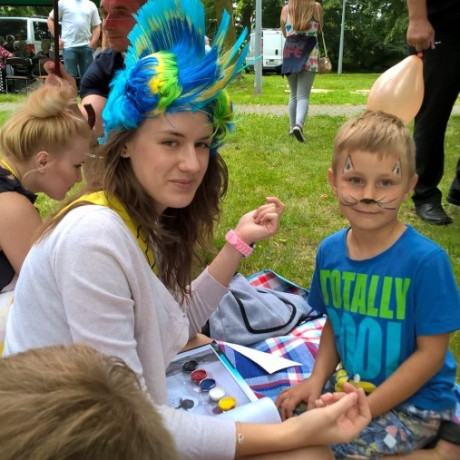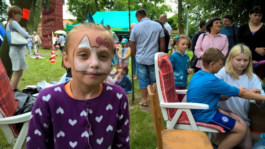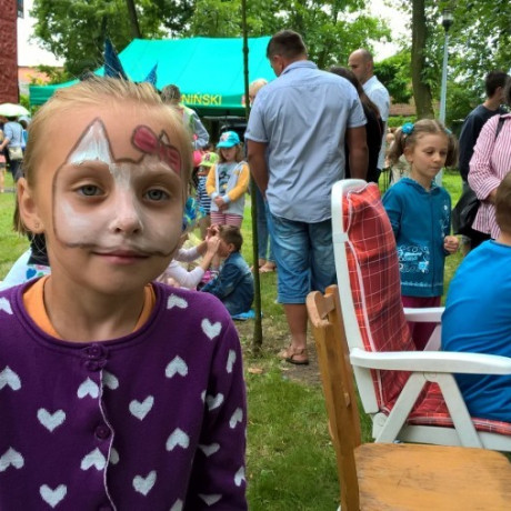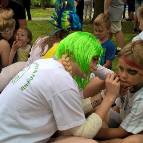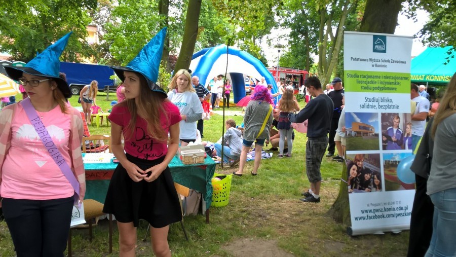 Pomimo, że rok akademicki zakończył się już a sesja egzaminacyjna trwa, studentki I i II roku pedagogiki przy wsparciu Małgorzaty Chybickiej, Ewy Łechtańskiej oraz Marcina Olejniczaka – wykładowców Zakładu Pedagogiki, czarowały dzieci wykorzystując do tego magiczne farby, kolorowe balony i słodkości. Same zresztą przyciągały uwagę kolorowymi bajecznie jaskrawymi perukami. Z dużym zaangażowaniem niestrudzenie odmieniały też dziecięce buzie. Mniejsze i większe pociechy cierpliwie czekały nie tylko w kolejce, ale i na efekt magicznych zabiegów i tego to, co zobaczą w lustrze. Nawet zmieniająca się pogoda, wietrzna i przekropna, nie zniechęciła dzieci ani studentek. Radość dzieci była nagrodą za trud przygotowań i męczącej pracy.