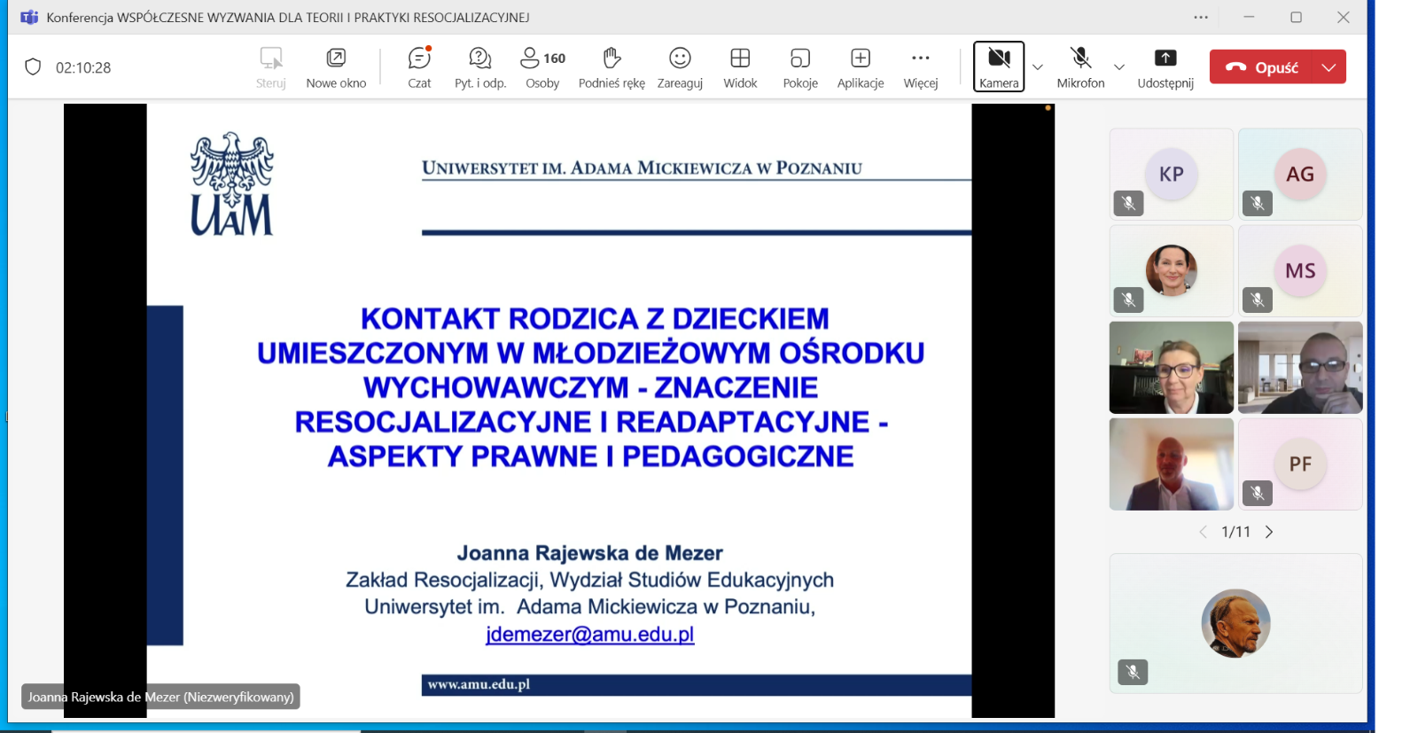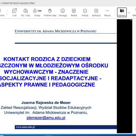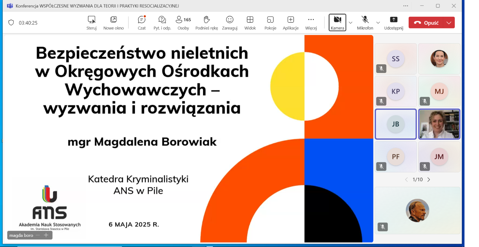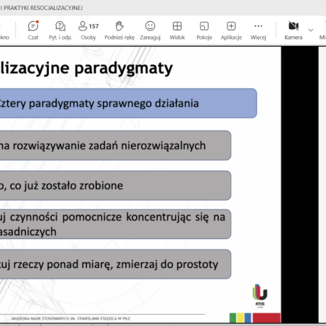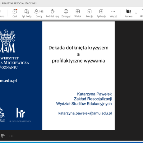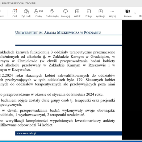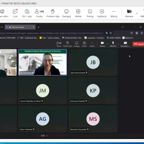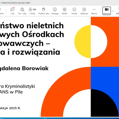 W kolejnej sesji, o resocjalizacji nieletnich, którą moderował dr hab. Jakub Bartoszewski, prof. ANS, autorzy wystąpień podejmowali zagadnienia dotyczące znaczenia resocjalizacyjnego i readaptacyjnego kontaktu rodzica z dzieckiem umieszczonym w młodzieżowym ośrodku wychowawczym (dr Joanna Rajewska de Mezer), wyzwań i rozwiązań dotyczących bezpieczeństwa nieletnich w okręgowych ośrodkach wychowawczych (mgr M. Borowiak), spektrum autyzmu jako wybranej cechy neuroróżnorodności w procesie resocjalizacji instytucjonalnej nieletnich (dr Marta Jurczyk) oraz czynników ryzykownych we współczesnej rodzinie (dr Marianna Styczyńska).