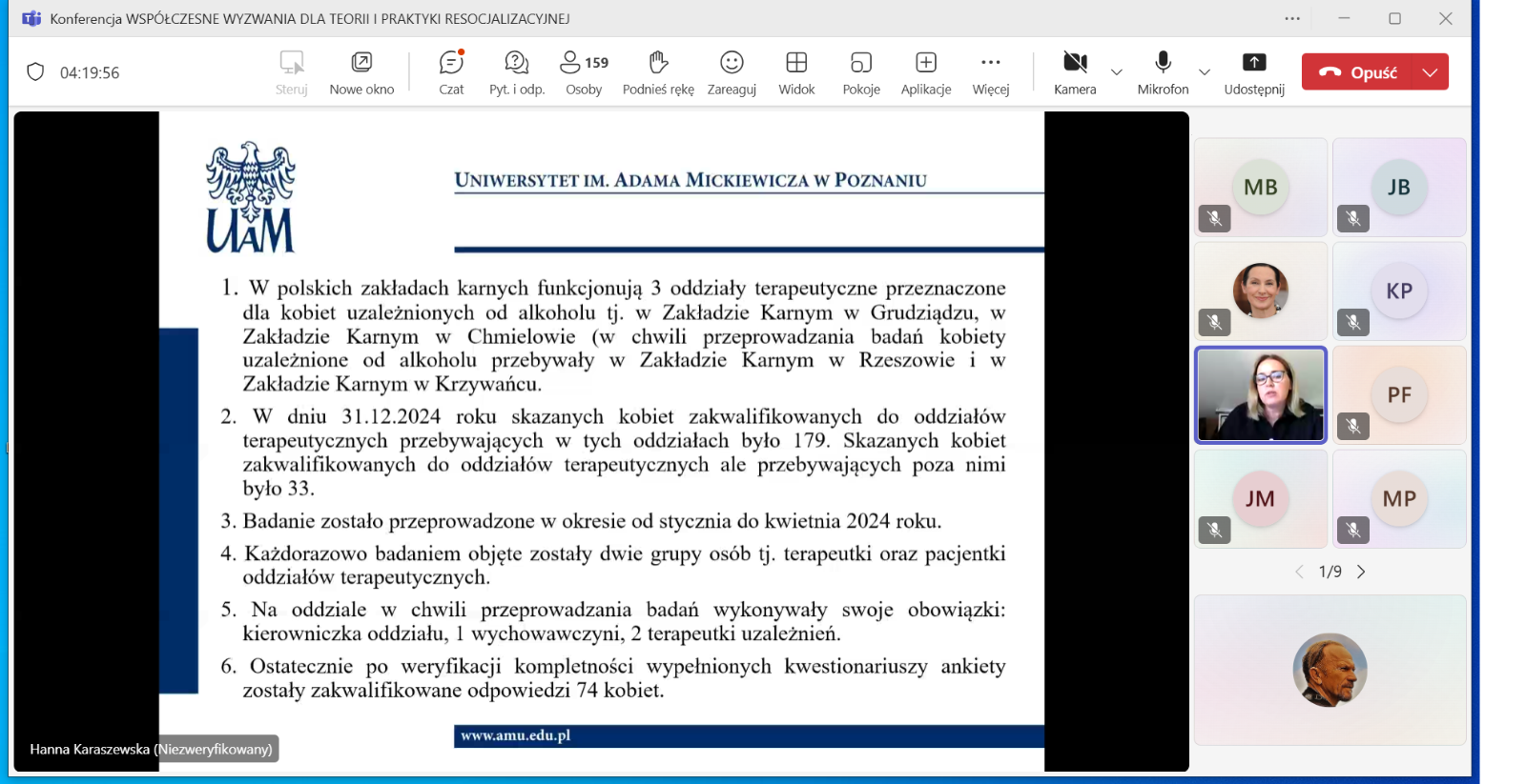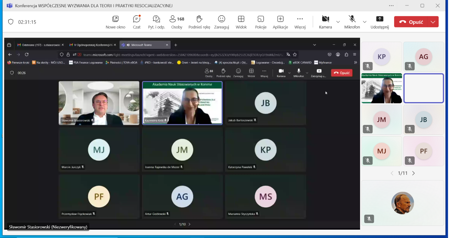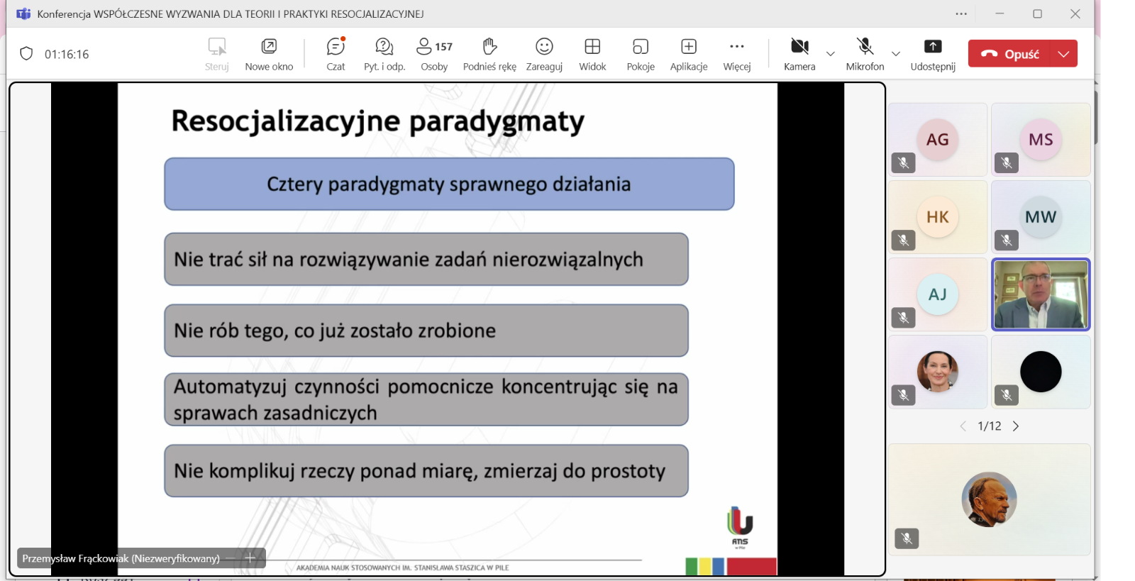 W kolejnej sesji, o resocjalizacji nieletnich, którą moderował dr hab. Jakub Bartoszewski, prof. ANS, autorzy wystąpień podejmowali zagadnienia dotyczące znaczenia resocjalizacyjnego i readaptacyjnego kontaktu rodzica z dzieckiem umieszczonym w młodzieżowym ośrodku wychowawczym (dr Joanna Rajewska de Mezer), wyzwań i rozwiązań dotyczących bezpieczeństwa nieletnich w okręgowych ośrodkach wychowawczych (mgr M. Borowiak), spektrum autyzmu jako wybranej cechy neuroróżnorodności w procesie resocjalizacji instytucjonalnej nieletnich (dr Marta Jurczyk) oraz czynników ryzykownych we współczesnej rodzinie (dr Marianna Styczyńska).