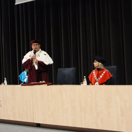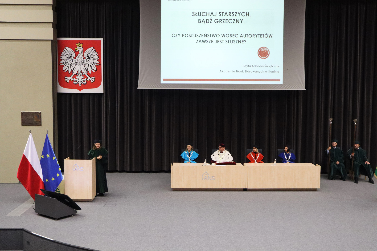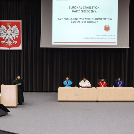 Na zakończenie, jak przystało na tego rodzaju spotkanie, zebrani w auli im. J.P. Kaczmarka wysłuchali wykładu inauguracyjnego. Dr Edyta Łoboda-Świątczak, adiunkt na Wydziale Nauk Humanistycznych i Społecznych, mówiła o mechanizmach, które prowokują do zachowań, którym się poddajemy, choć nie zawsze tego chcemy. Wyszła od wszechobecnego „nakazu” – „słuchaj starszych, bądź grzeczny” i dalej pytała, czy posłuszeństwo wobec autorytetów jest słuszne. Opowiedziała o eksperymencie Stanleya Milgrama, który pokazał, że pod wpływem autorytetu (często niesprawdzonego) ludzie są skłonni do przemocy. Wyjaśniła też, dlaczego ten mechanizm działa. – Po pierwsze spadek osobistej odpowiedzialności, bo „on mi kazał”, po drugie efekt wychowania, po trzecie automatyczny wyzwalacz posłuszeństwa, np. ubiór, tytuł, a nawet siwe włosy, po czwarte bezrefleksyjność, a właściwie bezmyślność, po piąte niejasność, nowość sytuacji, i w końcu znaczenie norm związanych z interakcją społeczną. Jaki z tego wniosek? Że złe jest bezrefleksyjne posłuszeństwo – wyjaśniła. A wystąpienie zakończyła znaczącym przesłaniem: – A co nas chroni? Wiedza, myślenie i czas.