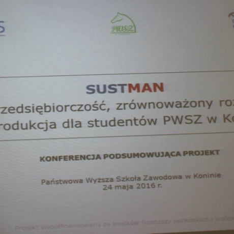 Państwowa Wyższa Szkoła Zawodowa w Koninie zakończyła realizację projektu „SUSTMAN – przedsiębiorczość, zrównoważony rozwój i produkcja dla studentów PWSZ w Koninie”, współfinansowanego ze środków funduszy norweskich i krajowych. Konferencja podsumowująca projekt, który trwał ponad rok, odbyła się 24 maja 2016 r. w auli PWSZ w Koninie przy ul. Przyjaźni 1