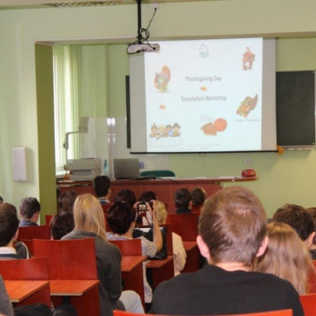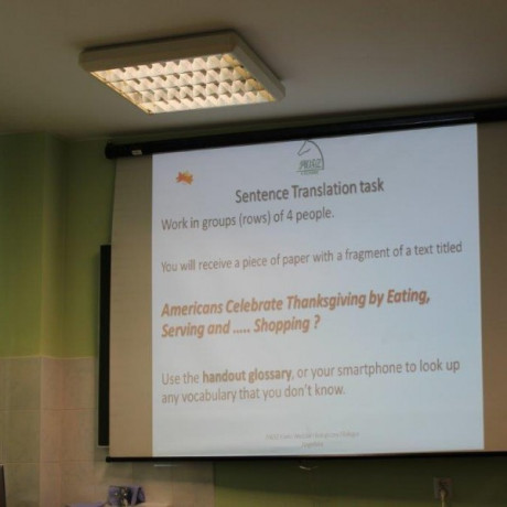 W czasie, gdy komisja oceniała prace konkursowe, uczniowie wzięli udział w warsztatach tłumaczeniowych, w których tematem przewodnim było amerykańskie święto Thanksgiving Day.