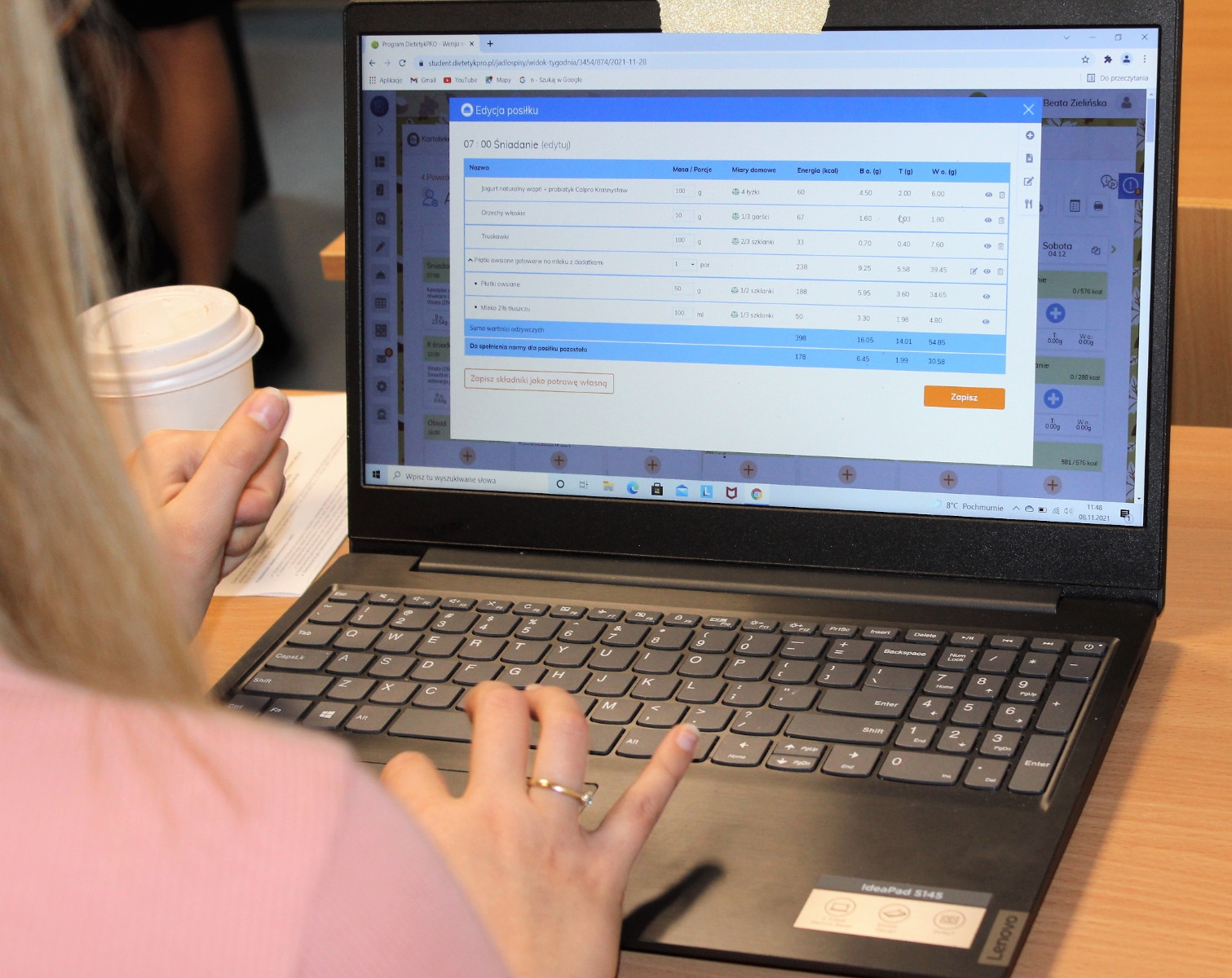 Przy okazji zakupu analizatora, uczelnia z tych samych środków wyposażyła pracownię dietetyki w program „Dietetykpro”. To program online do układania jadłospisów. – Pozwala prowadzić poradnię dietetyczną na dowolnym urządzeniu i gdziekolwiek. Wystarczy, by był dostęp do internetu – mówi menedżerka. A studentki, już obyte z jego obsługą, tłumaczą: – Z jego pomocą robimy wywiad żywieniowy, który uwzględnia choroby pacjenta, alergie, przyjmowane leki, tryb życia, a nawet to, że czegoś nie może jeść lub zwyczajnie nie lubi, choćby kalafiora czy kaszy gryczanej – wyjaśnia znad ekranu, na którym widać postępy w układaniu zadanego menu, Beata Zielińska, również studentka ZP. – Bierze nawet pod uwagę sprzęt kuchenny, jaki pacjent ma w domu. Nie każdy ma wypasioną kuchnię, na przykład starsze osoby – dodaje Natalia Sekrecka. Na koniec wywiadu program oblicza docelową masę ciała pacjenta, jego zapotrzebowanie energetyczne oraz odżywcze. Studentki dodają, że ma także bazę produktów i potraw wraz z ich wartością energetyczną i odżywczą. – Ale można do niej dodać inne produkty. Dobrze się na nim pracuje – zapewniają.