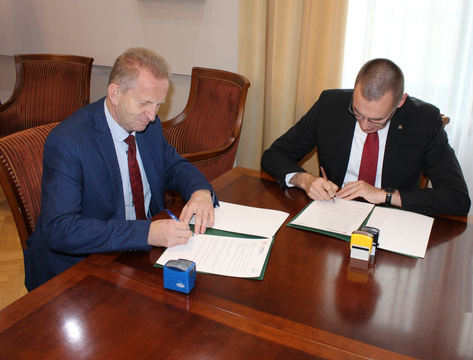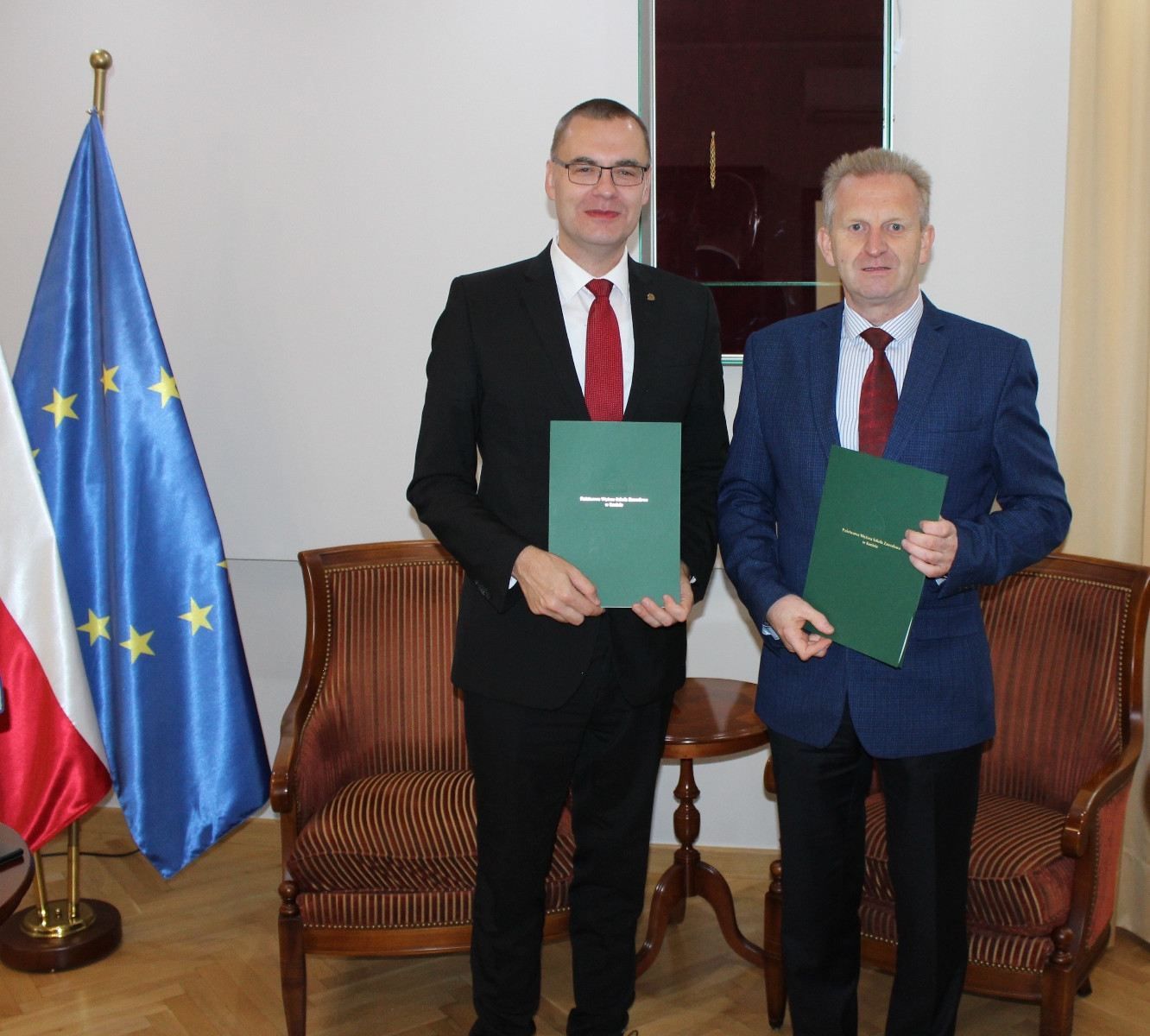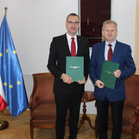 Prof. zw. dr hab. Mirosław Pawlak, rektor Państwowej Wyższej Szkoły Zawodowej w Koninie oraz Andrzej Budny, dyrektor Centrum Wsparcia Rzemiosła, Kształcenia Dualnego i Zawodowego w Koninie w dniu 2 października br. podpisali umowę partnerską.