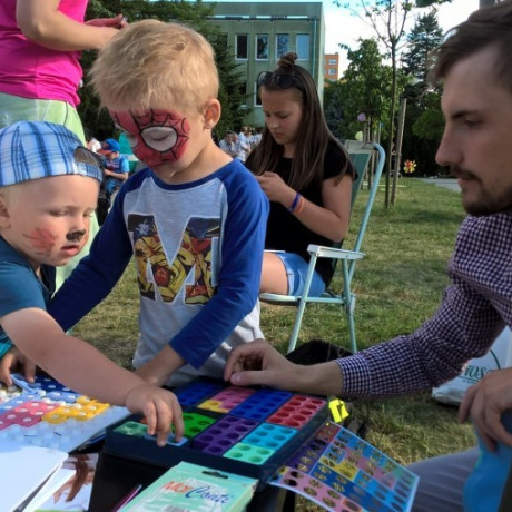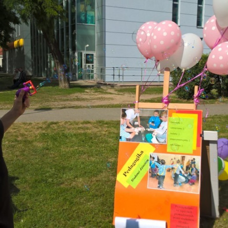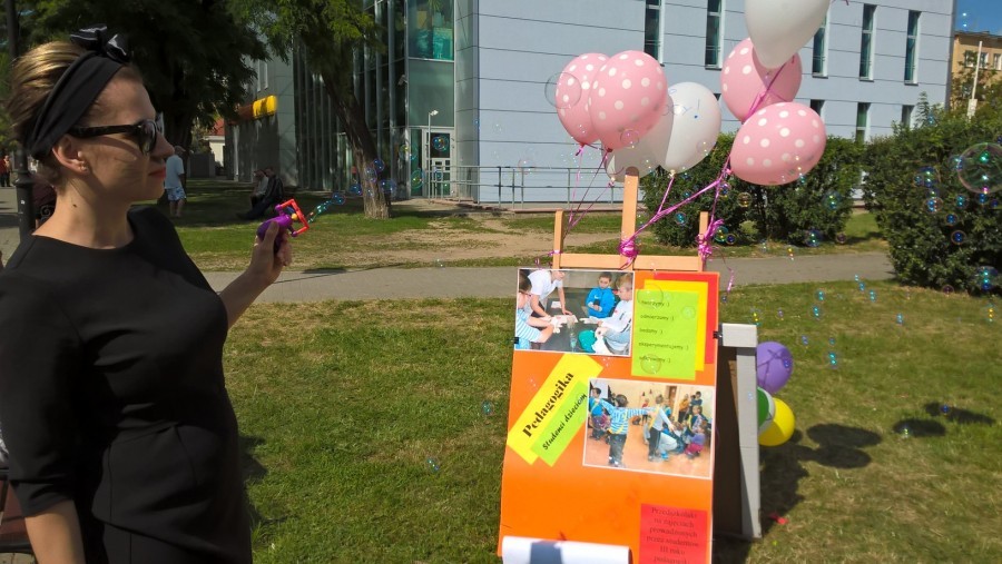 Studentki pedagogiki opiekuńczo-wychowawczej z poradnictwem psychologiczno-pedagogicznym przebrane i pomalowane za bajkowe zwierzęta przygotowały Salon Bajkowych Twarzy, w którym przemieniały buźki dzieci w kolorowe postacie. Nie było łatwo – mówią studenci, cztery stoiska były wciąż pełne dzieciaków. Oprócz malowania twarzy studenci przygotowali różne zabawy, układanki, łamigłówki matematyczne z licznymi nagrodami. Dużym powodzeniem cieszyły się bańki mydlane.