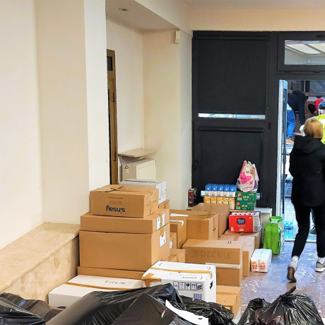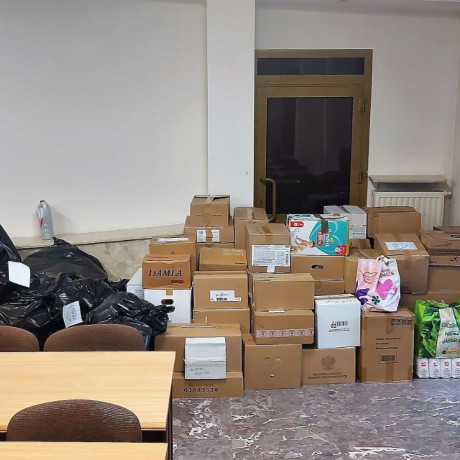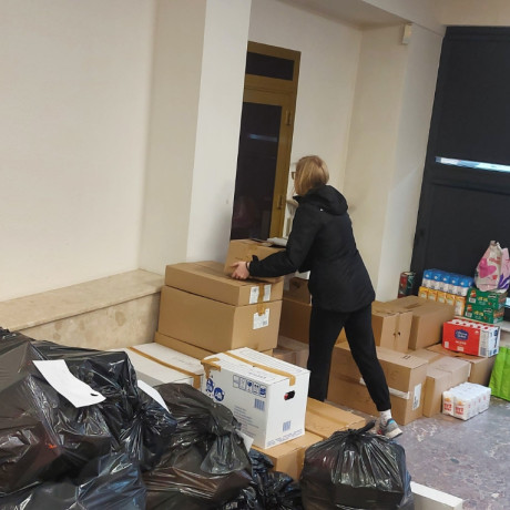 – Ludzie przynosili różne rzeczy. Najbardziej zależało nam na tych artykułach dla dzieci, ale też chemicznych, kosmetycznych i sanitarnych, najlepiej dobrze zapakowanych. Z tym bywało różnie, dlatego nasi studenci posegregowali to, bo była tego dosłownie sterta, i popakowali w kartony – Sylwia wskazuje ręką na te, które jeszcze nie trafiły na pakę ciężarówki. W sumie to 70 kartonów z żywnością i 50 z artykułami chemicznymi. Poza tym pod drugą ścianą czekają porządnie zwinięte w folię lub worki koce, kołdry, karimaty, ciepła odzież, pościel. Jest sporo rzeczy dla dzieci, w tym zabawki, słodycze, a nawet butelki i smoczki.