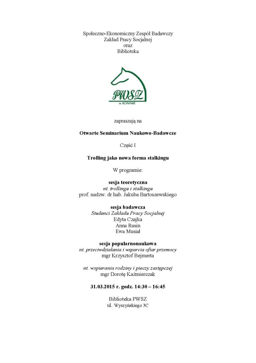 Otwarte Seminarium Naukowo-Badawcze Część I Trolling jako nowa forma stalkingu sesja teoretyczna nt. trollingu i stalkingu prof. nadzw. dr hab. Jakuba Bartoszewskiego