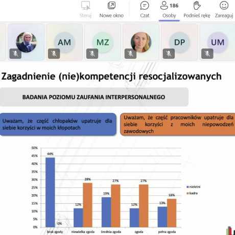 Z kolei mgr Anita Kotlenga, przedstawicielka Oddziału Zewnętrznego w Chojnicach, przedstawiła wyniki badań własnych związanych ze specyfiką przestępczości gwałtownej przejawianej przez młodocianych sprawców. Prelegentka podkreśliła znaczenie relacji interpersonalnych w rodzinie generacyjnej oraz rolę otoczenia i czynników spustowych jako tła motywacyjnego popełnianych przestępstw. Wskazała również na rolę niesprawiedliwości społecznej i braku pozytywnej stymulacji.