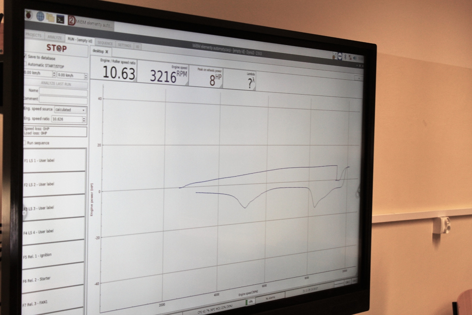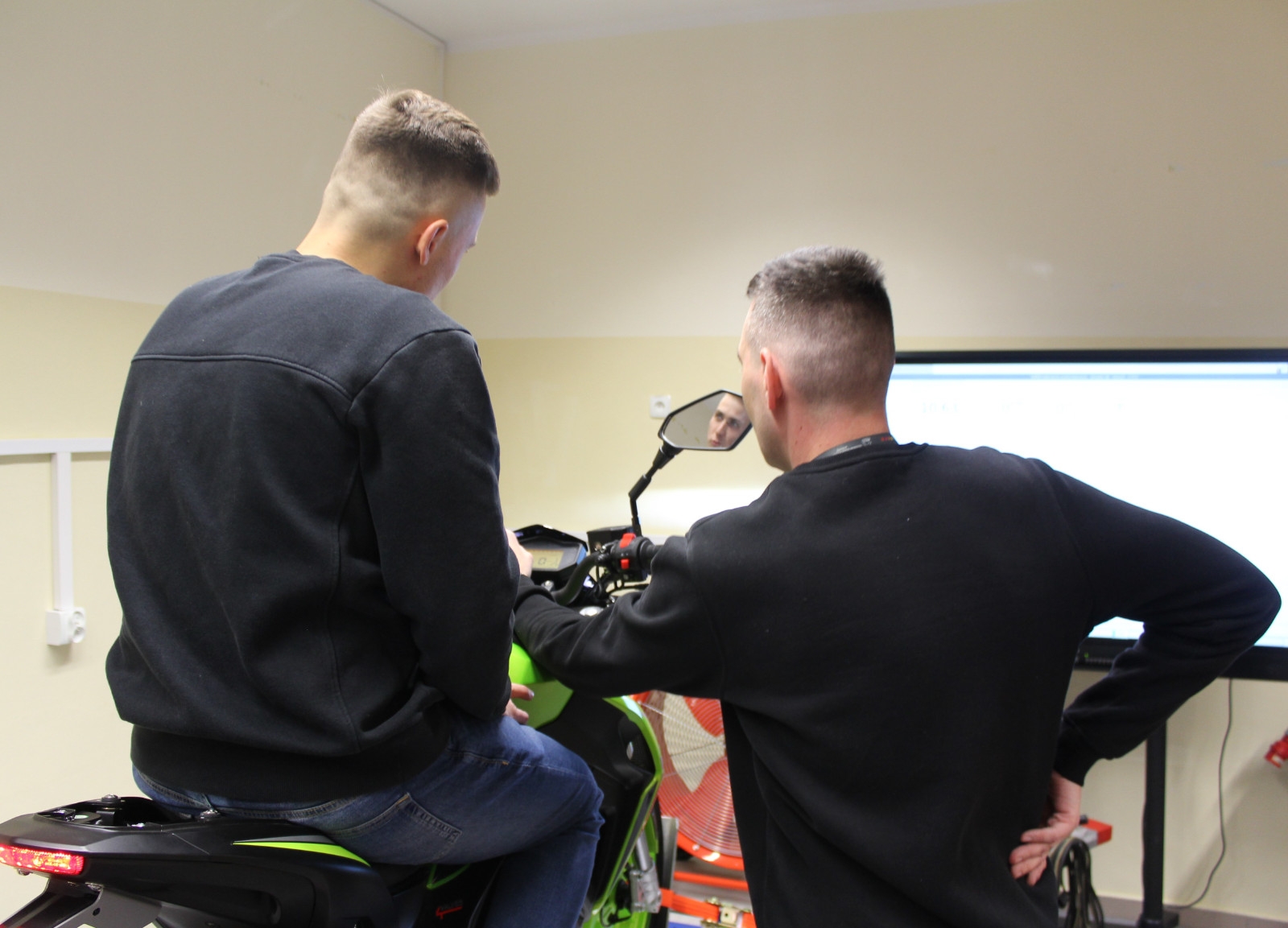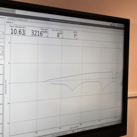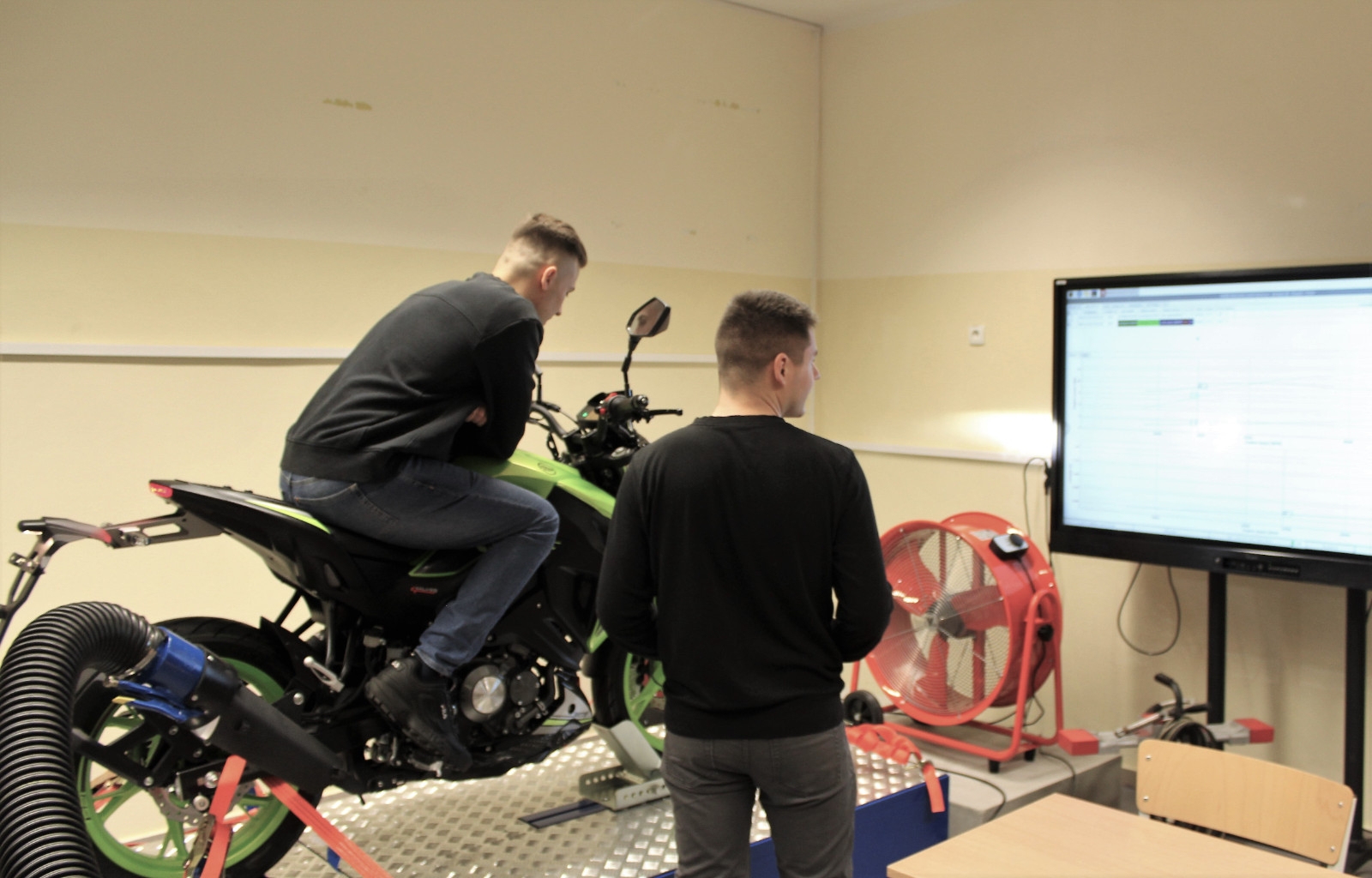 Na stojący na hamowni motocykl spalinowy wsiada Kamil Ligocki z IV roku MiBM, odpala silnik, który chwilę później osiąga ponad 9 tys. obrotów na minutę – to maksimum dla tego modelu. W pomieszczeniu panuje dość natężony hałas, ale przy takich badaniach inaczej się nie da. – Gdybym był na drodze, jechałbym na szóstym biegu z prędkością około 120 kilometrów na godzinę – wyjaśnia. W czasie, gdy Kamil „rozpędza” motor, ekran z wynikami pomiaru obserwuje Adrian Obrzut, kolega z roku. – Moje zadanie polega na obsłudze programu hamowni i analizie wyników, by dowiedzieć się, ile koni mechanicznych ma ten pojazd, jaki jest maksymalny moment obrotowy, który odpowiedzialny jest za elastyczność silnika, i jakie są straty mocy w układzie napędowym – wymienia.