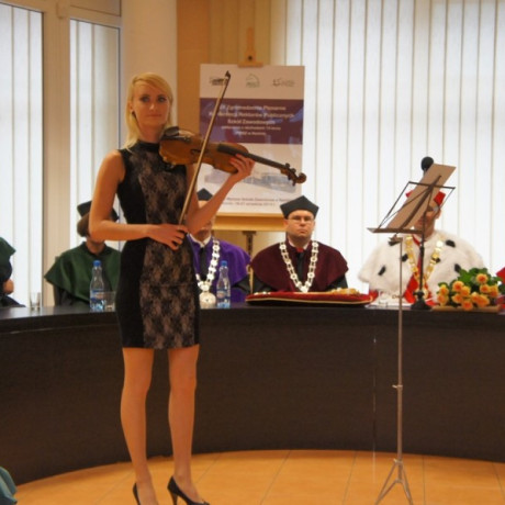Uroczyste posiedzenie Senatu i Konwentu zakończył koncert w wykonaniu skrzypaczki Pauliny Wawrzyniak, studentki III roku pedagogiki, przy akompaniamencie fortepianowym Kamila Trzebińskiego.