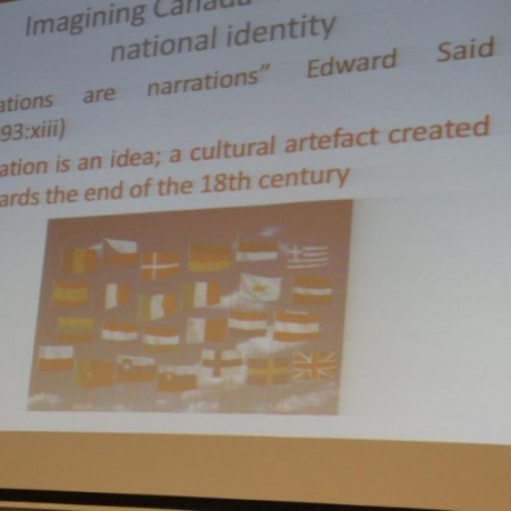 Pierwszy z wykładów konferencji, „Imagining Canada”, przygotowany przez dr Ewę Urbaniak-Rybicką z Katedry Filologii PWSZ w Koninie i inicjatorkę tej konferencji, służył na wstępie zapoznaniu z tak podstawowymi informacjami jak położenie, języki urzędowe, największe miasta, ośrodki, najbardziej znane miejsca, zjawiska i symbole, z jakimi ten kraj się kojarzy. Późnej jednak prelegentka skupiła się na rozważaniach Kanadyjczyków na temat ich tożsamości narodowej. Bowiem Kanada, podobnie jak USA, jest tyglem, w którym stopiły się różne narodowości: tubylcze, czyli Inuici i Indianie, oraz te z niemal całego Starego Kontynentu. Wielokulturowość to atut, i jednocześnie temat przewodni, pod którym w ostatnich dziesięcioleciach budowane jest pojęcie kanadyjskiej tożsamości narodowej i który w swojej polityce uwzględniają kolejne rządy.
