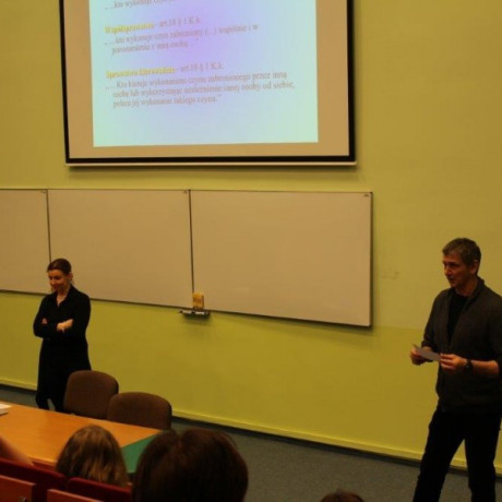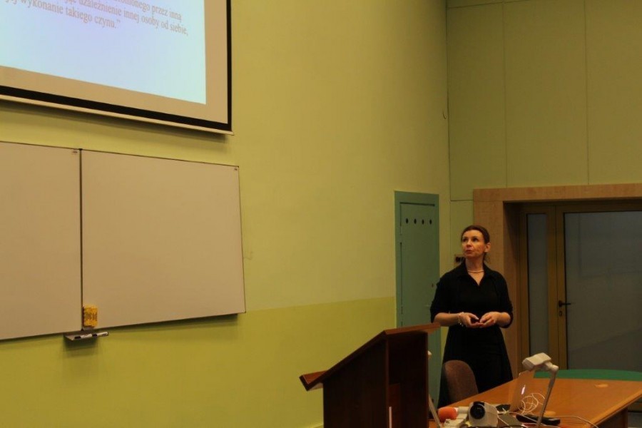 Tematem wykładu dr Joanny Rajewskiej de Mezer, były „Zasady odpowiedzialności karnej. Formy popełniania przestępstw”.