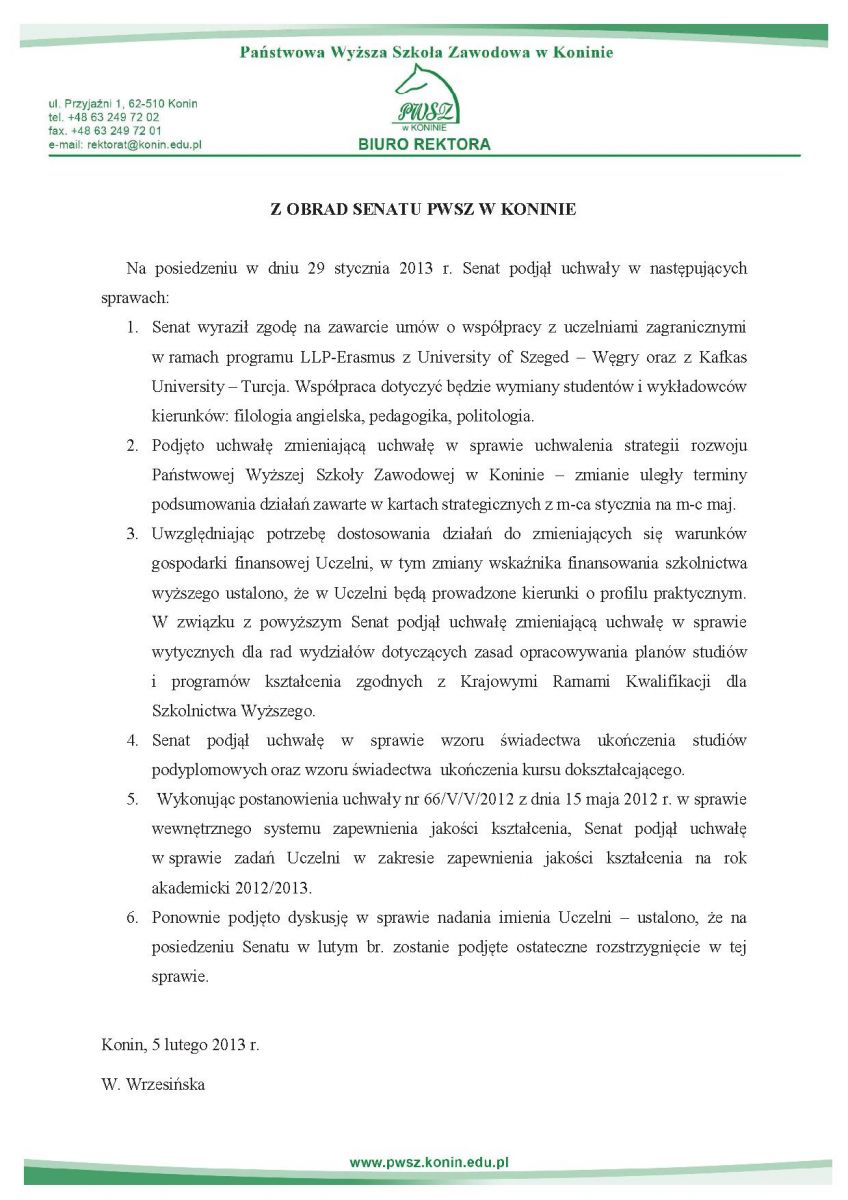 Na posiedzeniu w dniu 29 stycznia 2013 r. Senat podjął uchwały w następujących sprawach: