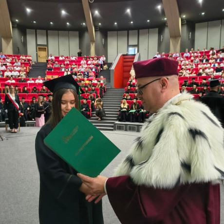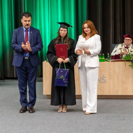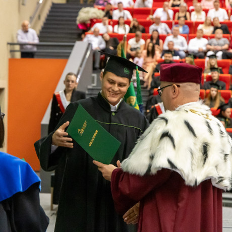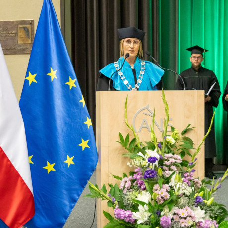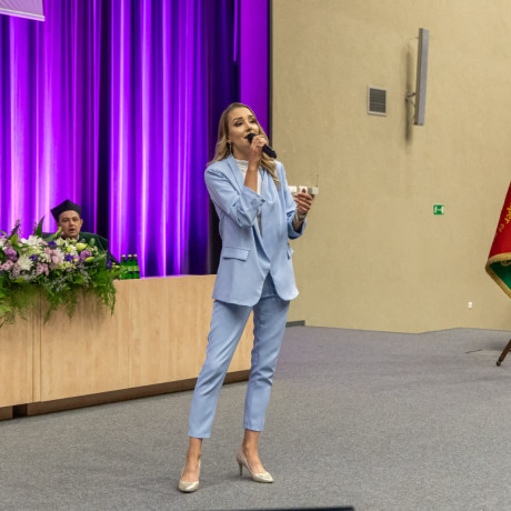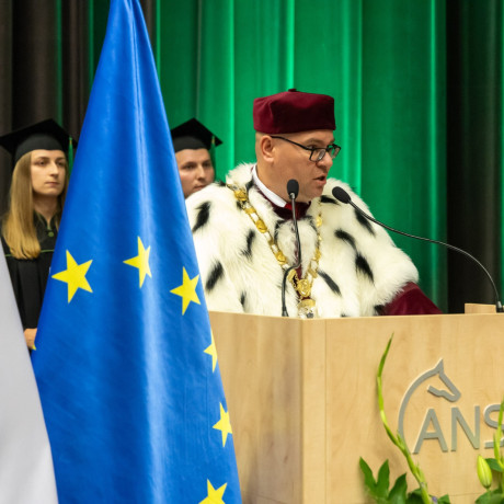 Natomiast dr hab. Artur Zimny, prof. i rektor ANS w Koninie, mówił do nich: – Wierzę, że studia wzbudziły w Was potrzebę dalszego dokształcania i doskonalenia. I zachęcał: – Tylko dzięki dalszej edukacji, ale nie online, lecz edukacji premium, czyli w murach naszej uczelni, będziecie Państwo w stanie szybko odnaleźć się w coraz bardziej dynamicznym otoczeniu – przyszłość jest coraz mniej przewidywalna.