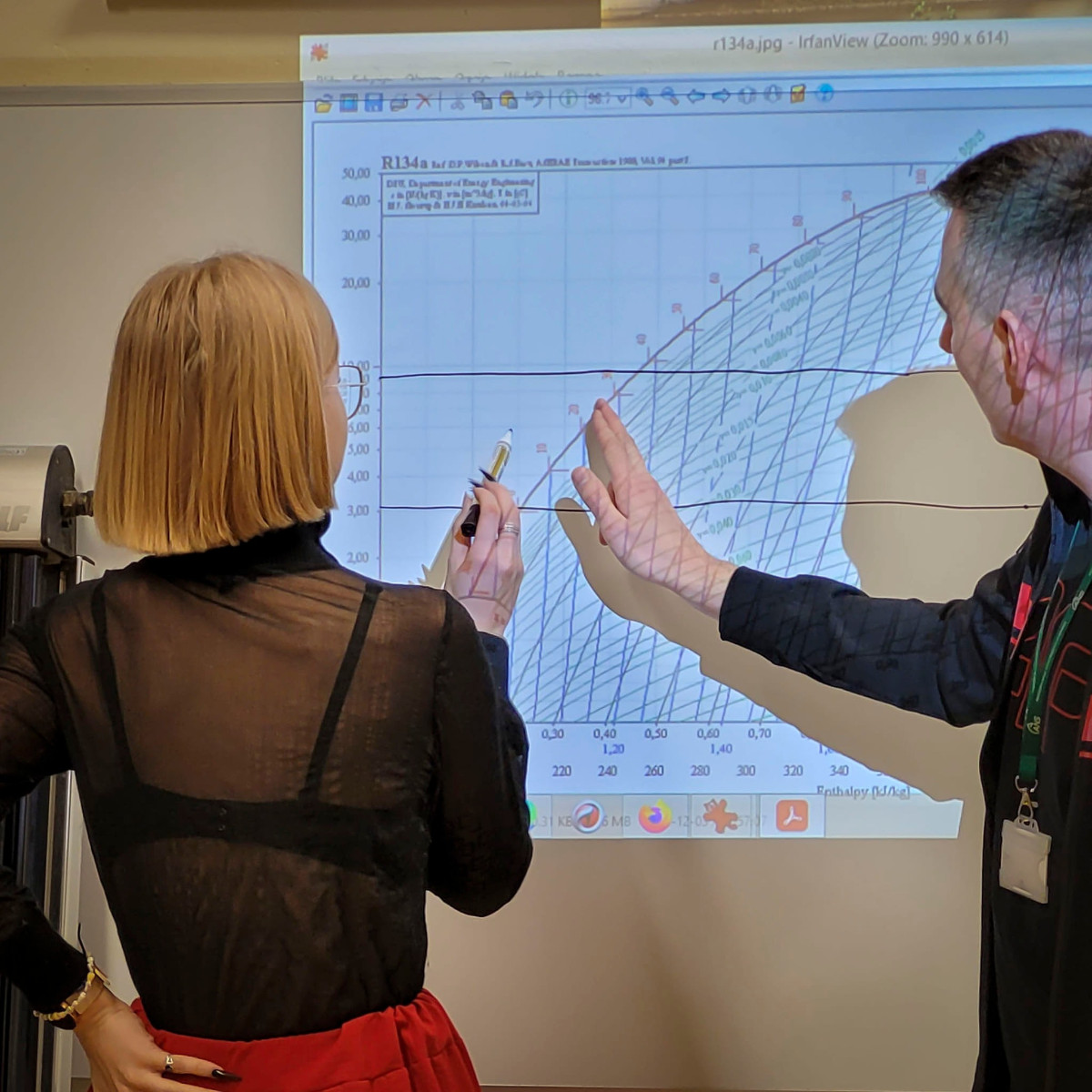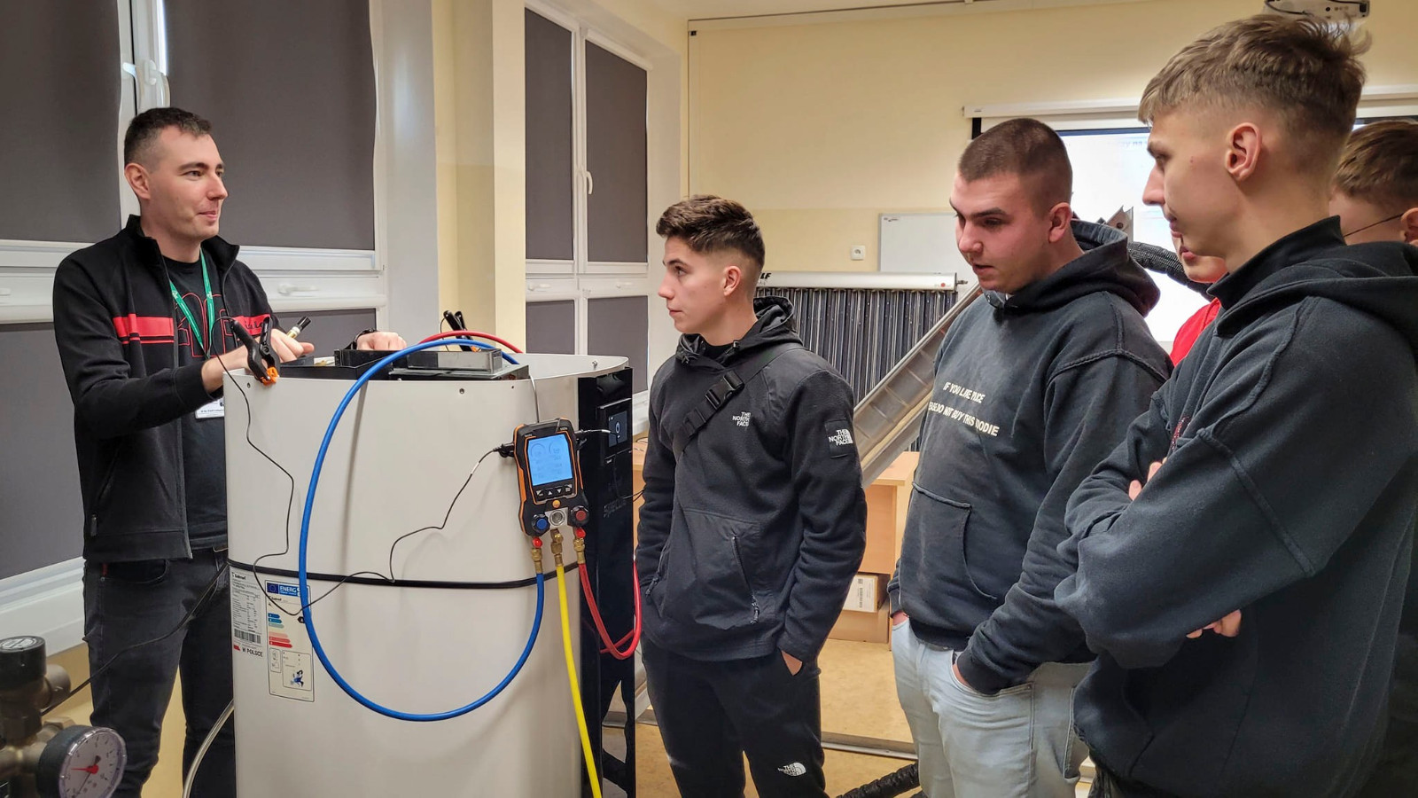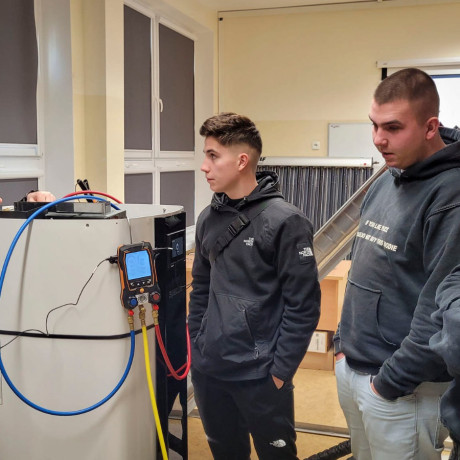 Podczas zajęć przedstawiono budowę pompy ciepła A/W, gdzie można było zidentyfikować wszystkie najważniejsze elementy w układach ziębniczych realizujących lewobieżny obieg termodynamiczny. Wskazano również na elementy, które ulegają zużyciu eksploatacyjnemu i na co należy zwrócić uwagę podczas przeglądu pomp ciepła. Przedstawiono także procedurę napełniania i odzysku czynnika chłodniczego oraz można było wyznaczyć temperaturę przegrzania na pracującym obiekcie.
