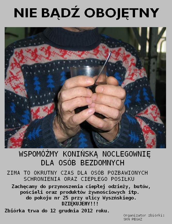 Studenckie Koło Naukowe PEGAZ organizuje zbiórkę odzieży, butów, pościeli oraz produktów żywnościowych na potrzeby Konińskiej Noclegowni.