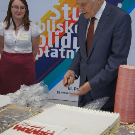 Nieoficjalnym zakończeniem spotkania były krótkie indywidualne rozmowy z gośćmi, wspólne zdjęcia i żarty. Obaj politycy są świetnymi rozmówcami. A kto miał szczęście, dostał z rąk prof. Buzka osobiście przez niego pokrojony tort, który przygotowano specjalnie na tę okazję.